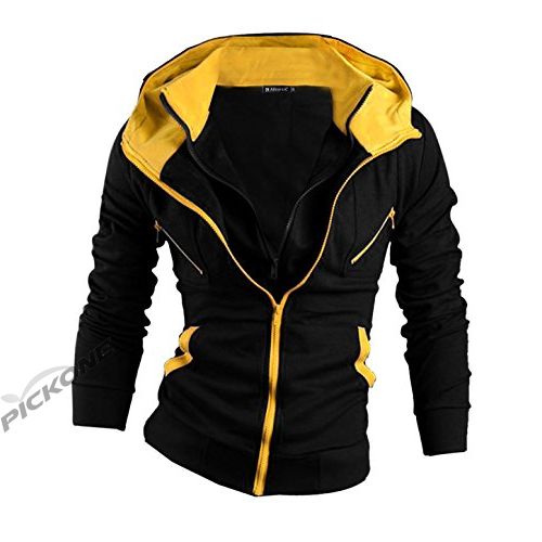 This jacket is a layered design, with kangaroo pockets, a stand collar, and a double zip up. It looks great over anything and will keep you warm on cold days.